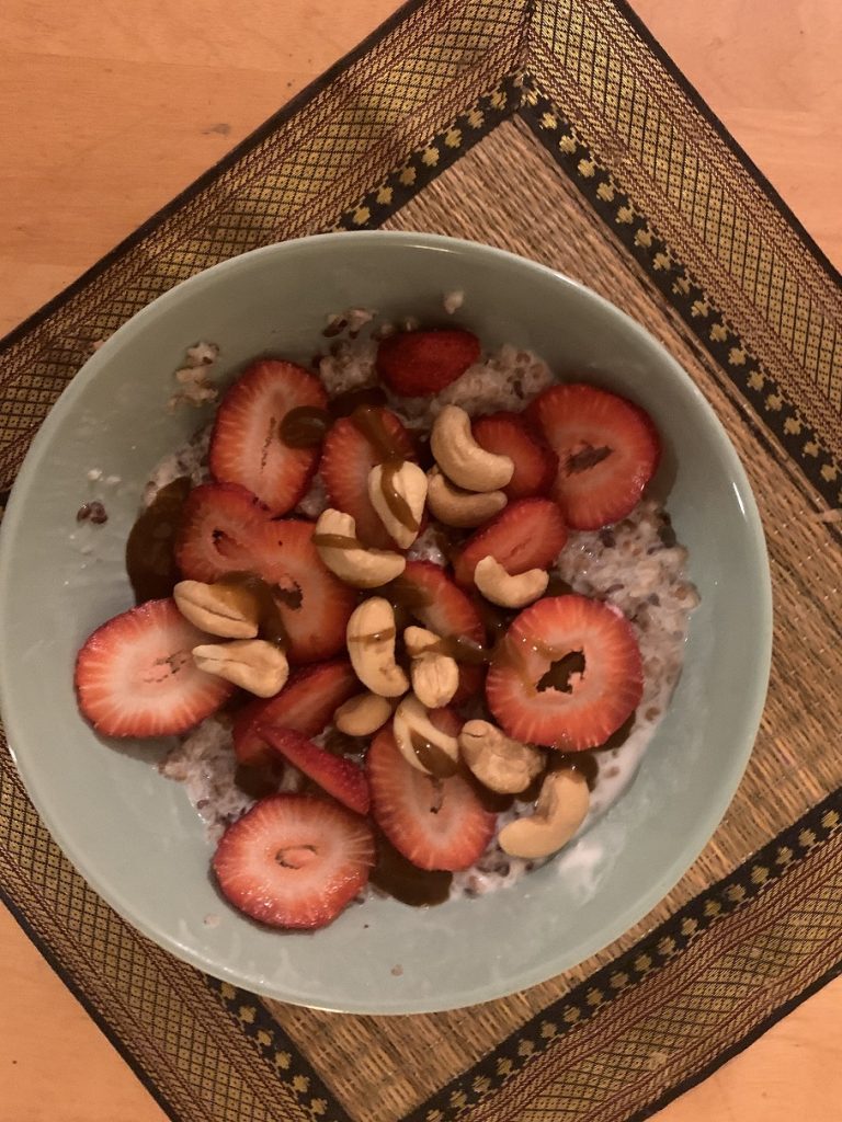 I added some yogurt, chopped up strawberries and cashews, and some store-bought coriander chutney for flavour. This was tasty! I liked it quite a bit more than oatmeal. There was more texture and body, and the porridge’s taste was nutty, but neutral enough to not get in the way of all the fruit and coriander chutney flavour bombs.